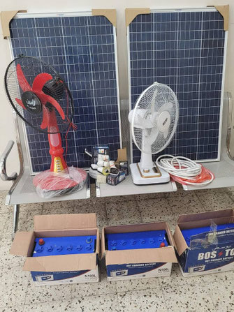 Für 3.800 € haben konnten 15 Familien mit einem Solarsystem ausgestattet werden. Es umfasst eine Batterie, einen Ventilator, ein Solarpanel mit Kabel, eine Lampe und ein Moskitonetz.